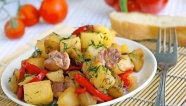 6. Выложите на сковороду картофель и обжаривайте со всех сторон до румяной золотистой корочки. Готовый картофель перенесите на тарелку, посолите, поперчите, украсьте зеленью и овощами.
