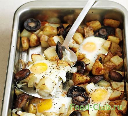 4. Затем достаньте форму и в овощах сделайте 4 ямки, в которые разбейте яйца. Верните в духовку на 3-5 минут (в зависимости от необходимой степени готовности яиц).