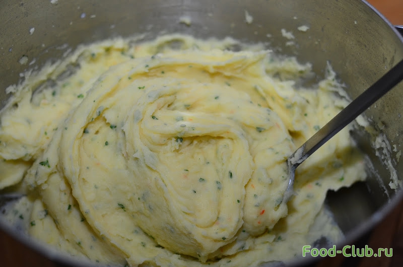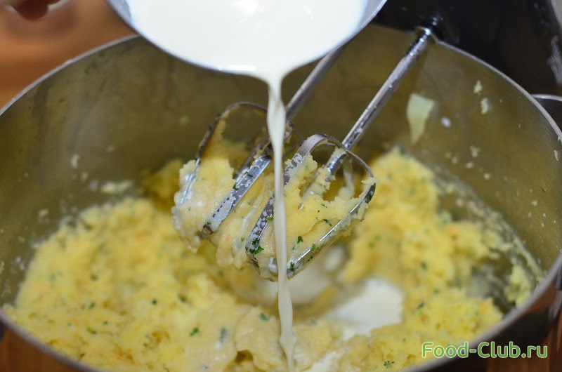 2. Сливаем воду с готового картофеля. Миксером взбиваем картофель в пюре, добавляем сыр Филадельфия, давленый чеснок и сливочное масло, можно составное (с петрушкой и красным перцем, например).