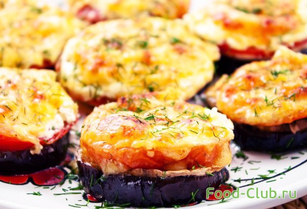 4. Разогрейте духовку. На противень выложите кружочки баклажанов, немного посолите, затем выложите грибы, кружочки помидорок и смажьте сметанным соусом. Натрите Сыр на мелкой терке и посыпьте каждый кусочек блюда. Поставьте в духовку минут на 30-35. При подаче посыпьте зеленью. Приятного аппетита!