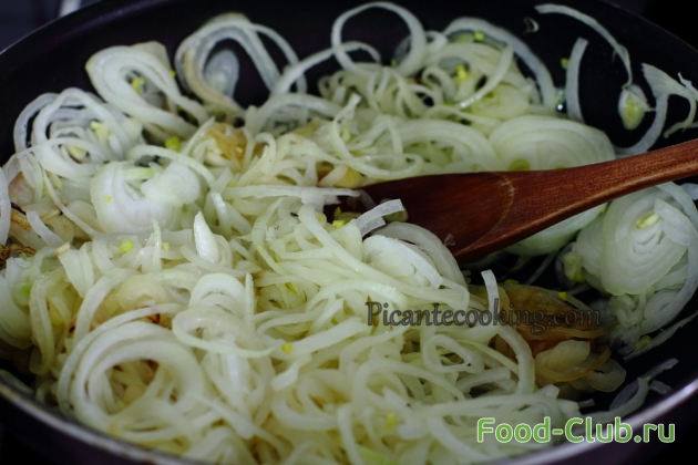 1. Лук очистите и нарежьте кольцами. Хорошенько разогрейте сковородку, добавьте в нее растительное и сливочное масло и когда сливочное масло перестанет пениться, добавьте лук. Добавьте соль и сахар, хорошенько перемешайте и тушите, иногда помешивая, пока лук полностью не размякнет и не приобретет насыщенный золотистый цвет. Это займет минут 25-30.