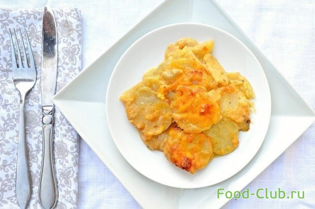 Противень смажьте маслом и выложите на него слой картошки, затем полейте сырным соусом. Повторите, пока не кончатся все ингредиенты. Сверху должен быть соус. Посыпьте последний слой остатками тертого сыра. Накройте противень фольгой и поставьте в духовку минут на 45, потом снимите фольгу и готовьте еще минут 30-40. Достаньте из духовки, дайте постоять минут 5, потом подавайте. Приятного аппетита!