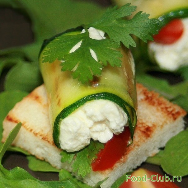 4. Когда цукини остыли на один конец капаем каплю масла, кладем пару кусочков чеснока, чайную ложку творожного сыра, веточку кензы и тоненькую полоску помидора. Рулетик скручиваем. Сверху рулет украшаем капелькой сыра и зеленью.