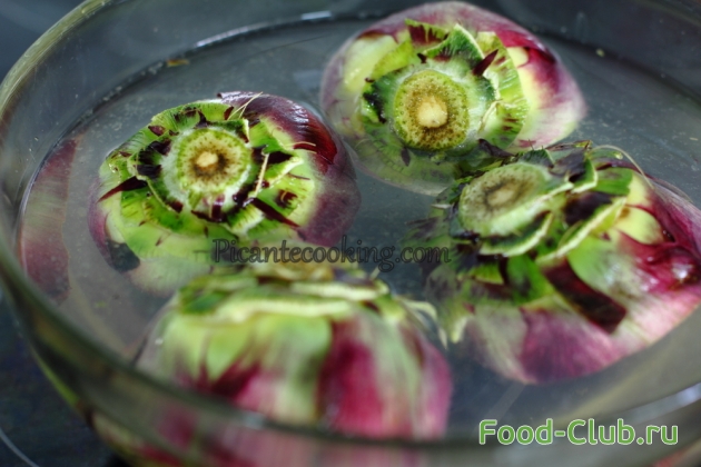 2. Воду заливаем в глубокую емкость, добавляем туда лимонный сок и опускаем туда артишоки сразу же после чистки, даем постоять 10 минут. Тем временем кипятим большое количество подсоленной воды, закидываем туда артишоки и варим 18-25 минут до мягкости овощей.