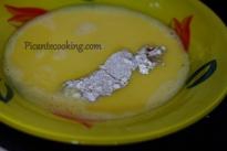 3. Мясо вынимаем из маринада и слегка обсушиваем бумажным полотенцем. Готовим ингредиенты для панировки, яйца взбиваем с водой в отдельной миске, в другую насыпаем муку, в третью кокосовую стружку. Кусочек мяса обмакиваем в муке, затем пропитываем яичной массой.