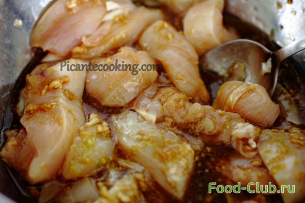 2. Мясо нарезаем небольшими полосками, перемешиваем с маринадом и ставим в холодильник на полтора – два часа.