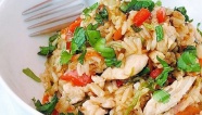 Взбиваем яйца и кефир, добавляем курицу и сыр, постепенно вводим в тесто муку, хорошенько все перемешиваем. Теперь мелко шинкуем зелень и добавляем ее к тесту, добавляем специи по вкусу.
