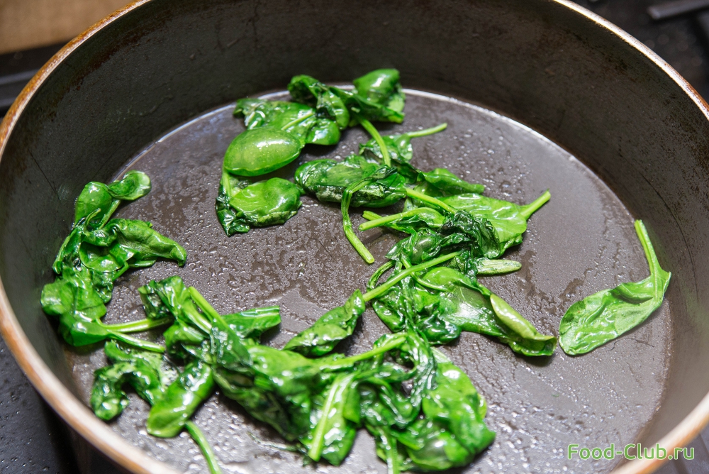 4. 4. В это время разогрейте сковороду с маслом, добавьте туда шпинат и обжарьте около 2-3 минут (шпинат должен стать мягким).