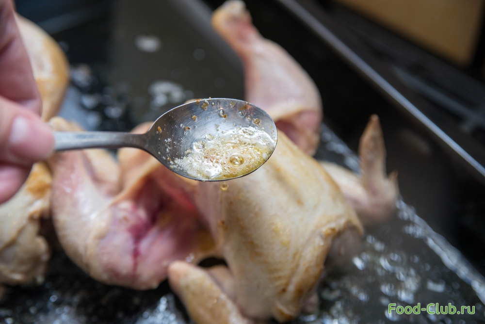 3. За это время 2-3 раза открывайте духовку и поливайте соками, которые выделяются из курицы. Благодаря этому курочка будет с хрустящей корочкой. Вытащите готовую курицу, оставьте на 10 минут, чтобы она впитала в себя все соки. Затем разделайте курицу.