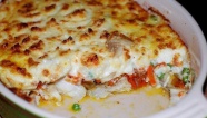 Теперь займемся соусом: помидоры ошпариваем и убираем шкурку, разрезаем их пополам и убираем семена. Крупно режем. Мелко шинкуем лук и обжариваем его на сковородке примерно минут 5, потом добавляем к нему чеснок и специи. Через несколько минут добавляем к луку помидоры, сахар, соль и перец. Наливаем стакан воды. Теперь ждем, пока закипит и тушим минут 15 на небольшом огне.