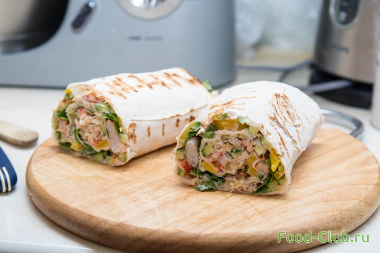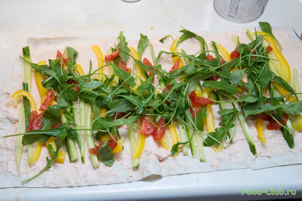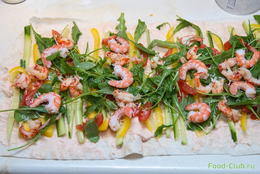 5. На овощи выложите креветки. Заверните лаваш в рулет.