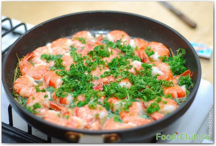 2. Креветки переворачиваем, посыпаем петрушкой и жарим еще пару минут. Огонь выключаем, креветки готовы. Очень важно не передержать блюдо на огне, иначе креветки станут резиновые.