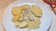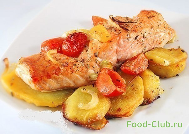 Приготовленный по этому рецепту лосось с картофелем- это отличное блюдо для всей семьи! Рыба получается очень ароматной, сочной и нежной. Готовить очень просто, попробуйте!Для начала нарежьте филе на крупные порционные куски. Поперчите, немножко посолите и оставьте рыбу пропитаться специями на 30 минут.