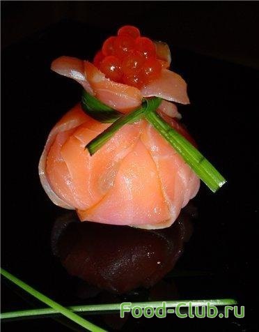 2. Нарезаем рыбу тонкими пластинами и выкладываем друг на друга три пластинки. В центр чайной ложкой помещаем творожный сыр с чесноком.