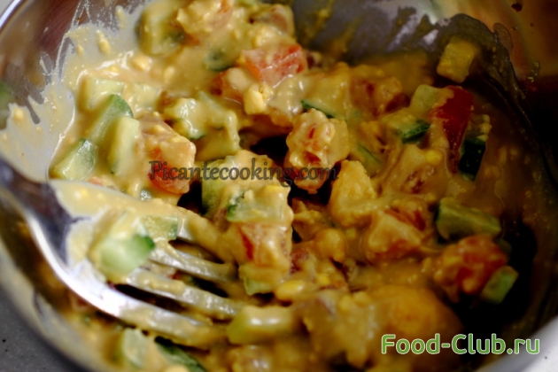 2. В глубокой миске перемешиваем желтки со всеми ингредиентами для фарша. Добавляем к массе 2/3 измельченной семги и нарезанных огурцов. Еще раз перемешиваем.