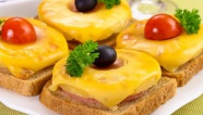 Грудку нарежем кусочками наискосок, выложим на багет, затем выложим бекон.