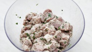 Полученную мясную массу очень тщательно вымешиваем и «выбиваем» (с силой бросаем в миску). Это важный этап, мясо станет вязким и послушным. Готовый фарш затягиваем пищевой пленкой и ставим в холодное место на 2 часа, мариноваться.