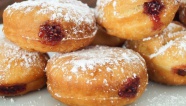 Теперь формуем небольшие булочки и выкладываем их на противень с пекарской бумагой так, чтобы между булочками было расстояние примерно в 5 см. Даем постоять минут 10. Смажем булочки размешанным яйцом и посыпаем сахаром. Отправляем в прогретую до 190 градусов духовку примерно на полчаса. Когда булочки станут румяными — они готовы. Выключаем духовку и оставляем еще минут на 10.