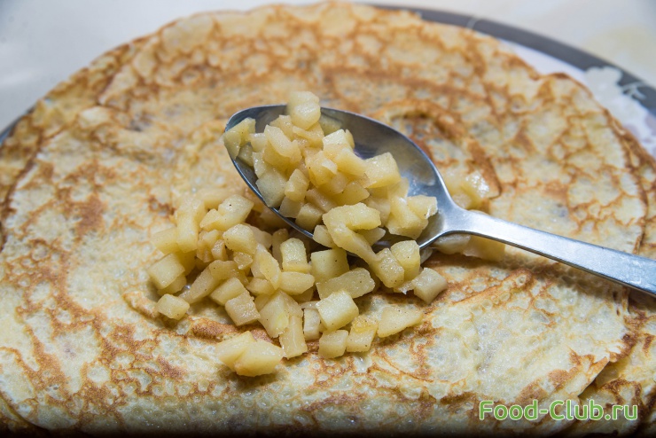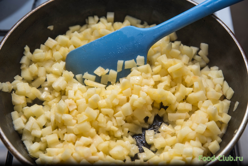 • Разогрейте сковороду со сливочным маслом и добавьте яблоки. Готовьте на умеренно среднем огне около 7-10 минут до размягчения яблок. В конце добавьте сахар и корицу.