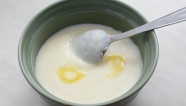 3. В духовку (до 160-180 градусов) поставьте жаропрочную широкую емкость с 1 л молока, дождитесь, когда на молоке появится пенка, вытащите из духовки молоко, снимите эту пенку (с помощью шумовки, пенку положите на тарелку) и поставьте молоко снова в духовку. Повторите эту процедуру 5-6 раз (в итоге должно получиться около 5-6 пенок).