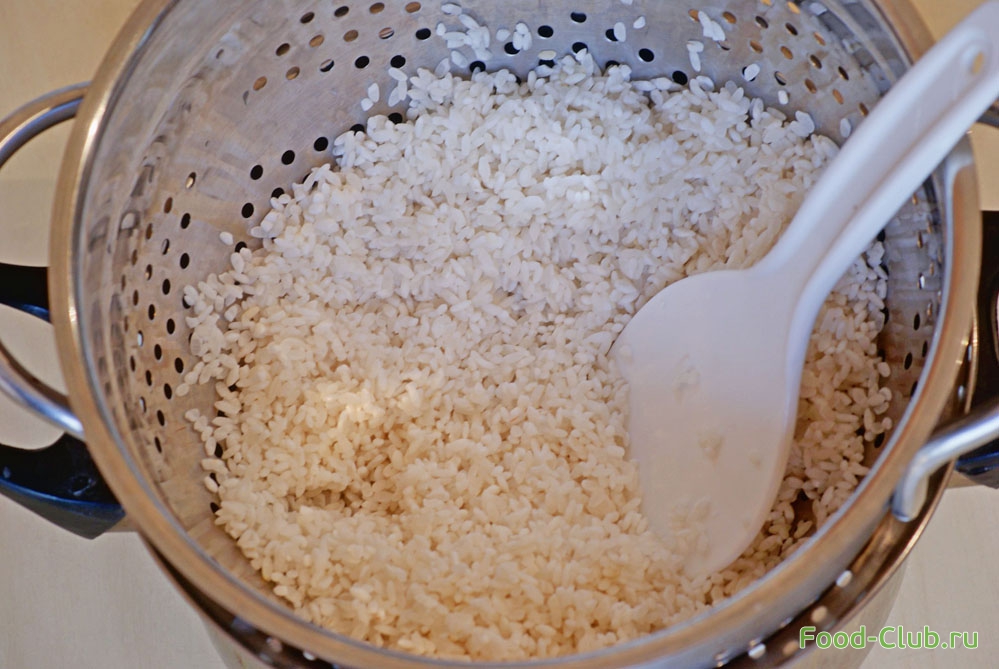 1. Тщательно промойте рис, отбросьте на дуршлаг и избавьтесь от лишней жидкости. В кастрюле доведите до кипения подсоленную воду (2 стакана), забросьте рис, масло и щепотку соли, готовьте на умеренно среднем огне до почти полного испарения жидкости (около 8-10 минут).