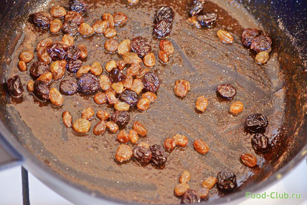3. Изюм залейте теплой водой или зеленым чаем на 7-10 минут, затем обсушите изюм. В небольшой кастрюльке или сотейнике растопите мед, добавьте апельсиновый сок, изюм и корицу, перемешайте и готовьте на слабом огне в течении 1-2 минут.