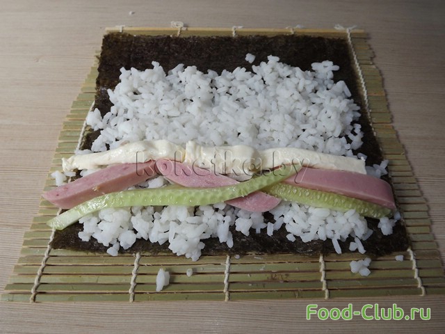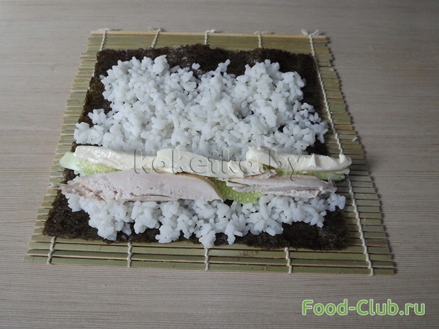 7. Начиняем роллы различными сочетаниями начинки: плавленый сыр, огурец, куриная грудка.