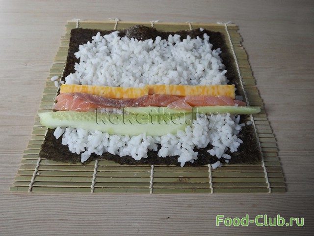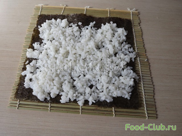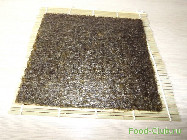 5. Для удобства расстилаем бамбуковую салфетку (макису), поверх выкладываем лист водорослей.