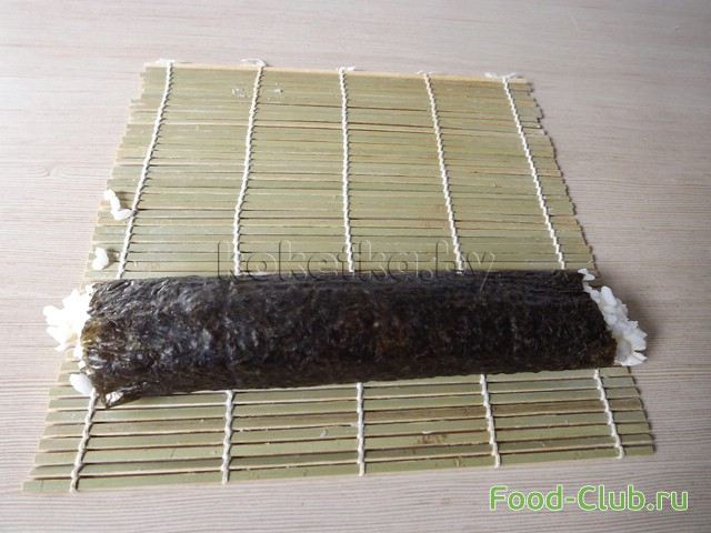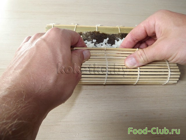 10. С помощью бамбуковой салфетки сворачиваем роллы.