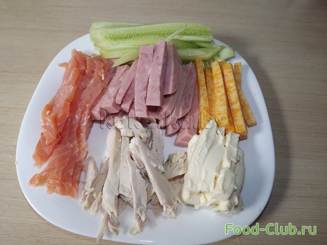 4. Готовим начинку. Причем здесь может быть полный полет вашей фантазии. Все ингредиенты для начинки (сыр, сычужный сыр, отварную грудку, красную рыбу, огурец, ветчину) нарезаем удлиненной соломкой.