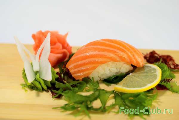 4.Когда все готово можно начинать собирать из рыбы и риса суши. Слепите из риса небольшой комочек (размером с нарезанные кусочки рыбы), смажьте его васаби и положите сверху кусочек рыбы.