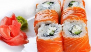 Подавайте на большом круглом блюде, в центре выложите маринованный имбирь, в отдельную тарелочку налейте соевый соус.
