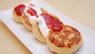 Подавайте сырники с клубничным соусом.