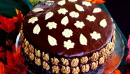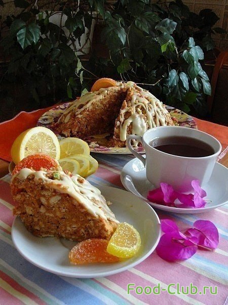 6. Выкладываем массу на декоративное блюдо и формируем горку. Украшаем тортик мармеладом, орехами и топленым шоколадом. Ставим десерт на пару часов в холодильник для пропитки, а затем подаем к столу. Приятного чаепития!