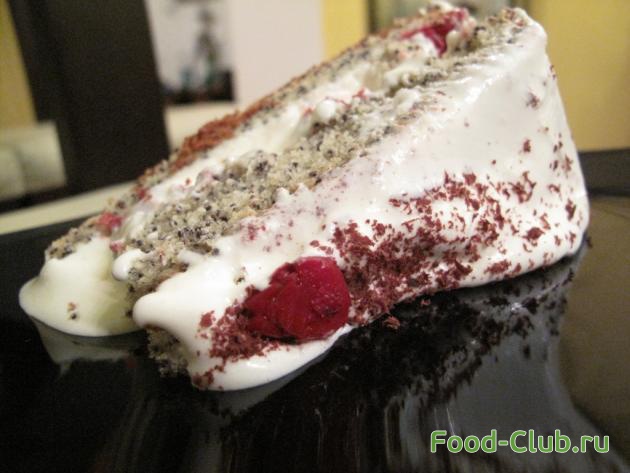 Это воздушный бисквитный торт с легким маково-вишневым привкусом. Десерт прекрасно подойдет в качестве украшения к любому праздничному столу.
