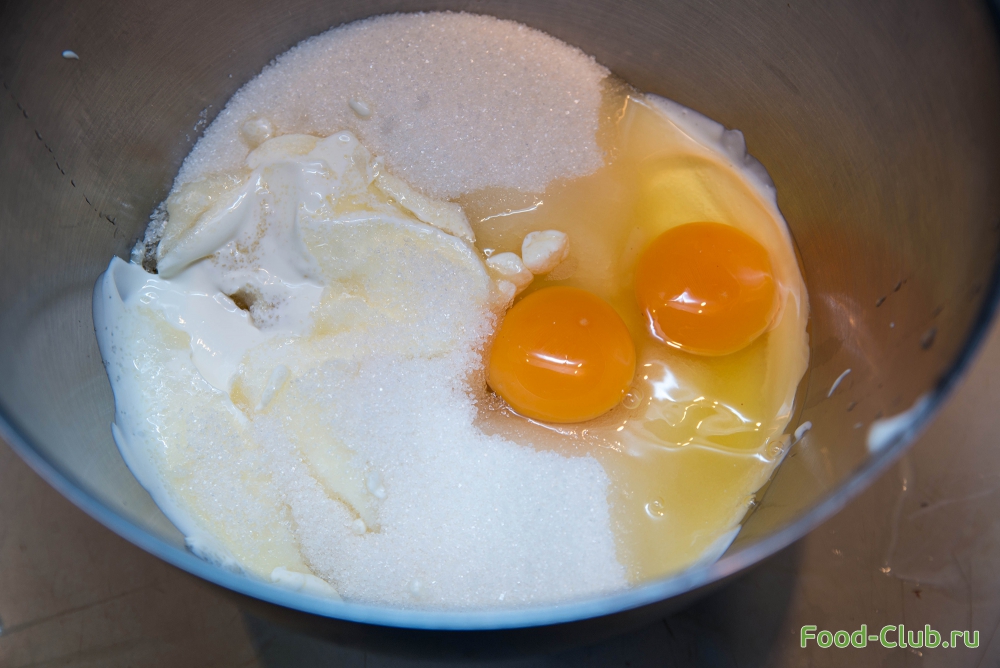 1. Для начала займемся приготовлением бисквитов для торта. Их будет два: светлый и темный. Взбейте сметану с яйцами и сахаром.
