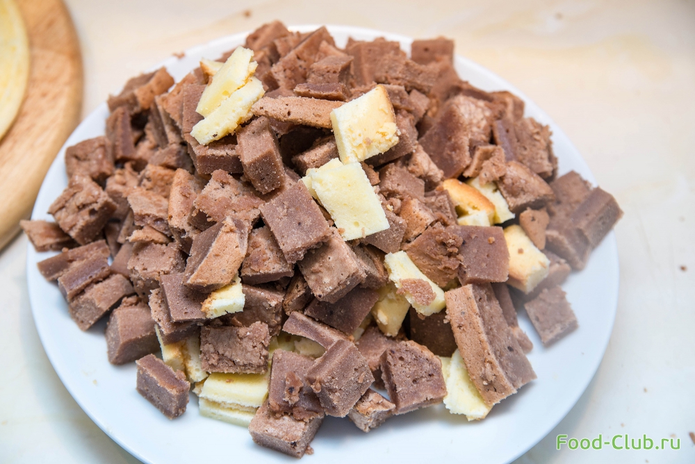 7. Оставшуюся часть белого бисквита и весь темный порежьте на небольшие кусочки.