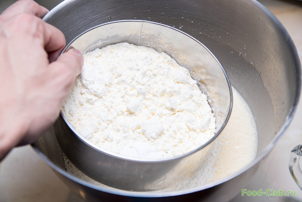 2. Просейте муку с разрыхителем и продолжайте взбивать до однородной консистенции.