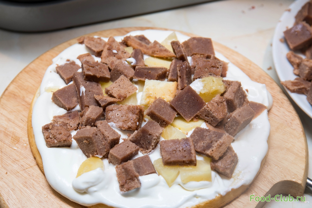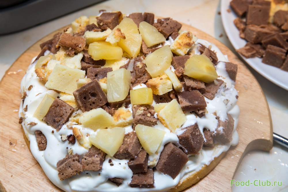 11. На крем выложите часть порезанных кусочков бисквита и ананасы.