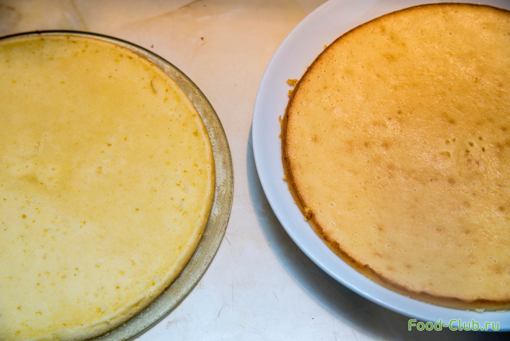 3. Половину теста вылейте в форму для торта и поставьте в духовку до готовности (примерно на 25 минут). Готовность проверьте зубочисткой (воткните в центр бисквита и вытащите, если зубочистка сухая, то бисквит готов).