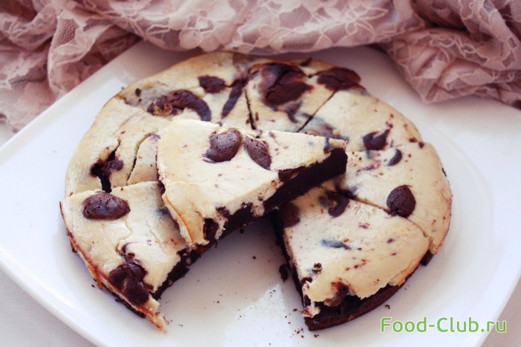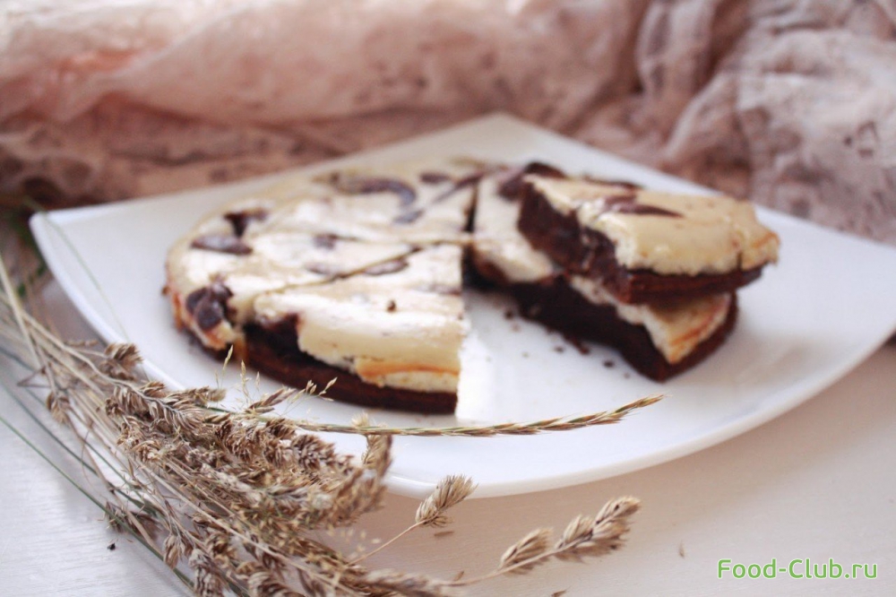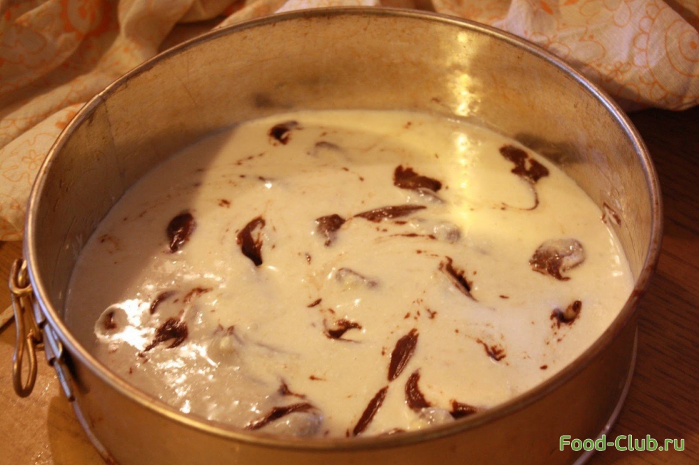 3. Форму для выпечки смажьте маслом, выложите в нее шоколадное тесто, а потом залейте творожной массой.