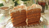 Разрежем корж пополам, смажем кремом в середине и верхушку. Украшаем на свой вкус, автор украсил крошкой с краев коржа и орехами.