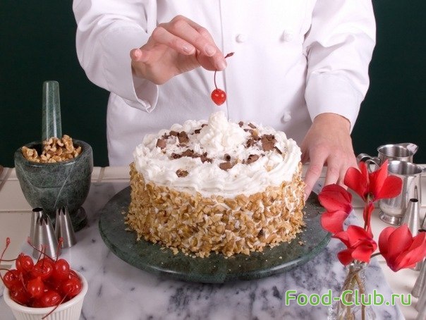 3. Достаньте торт, снимите форму и украсьте торт молотыми грецкими орехами и тертым шоколадом.