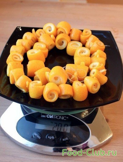 4. Взвешиваем кожуру, с 3-х апельсинов получается где-то 200 грамм. Пропорции варенья на 1 часть корок, полторы части сахара и 2 части воды.