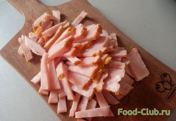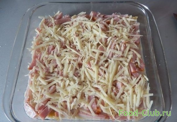 2. Посыпьте слой ветчины солью и специями по вкусу (не переборщите с солью, ветчина соленая).