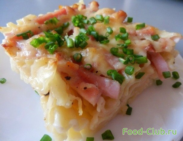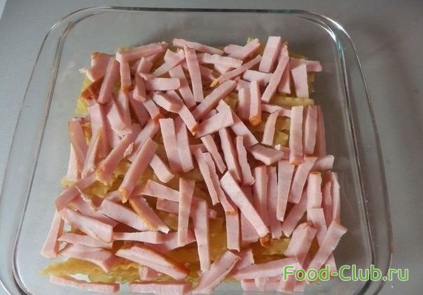 В форму ровным слоем выложите макароны. Нарежьте ветчину соломкой и выложите ее на макароны. -