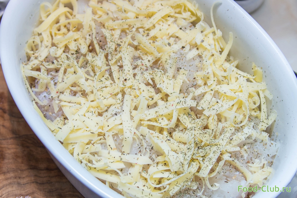 2. В жаропрочную емкость уложите на дно половину картошки, положите немного сливочного масла, посолите и поперчите, сверху выложите рыбу и половину сыра, посолите и поперчите.