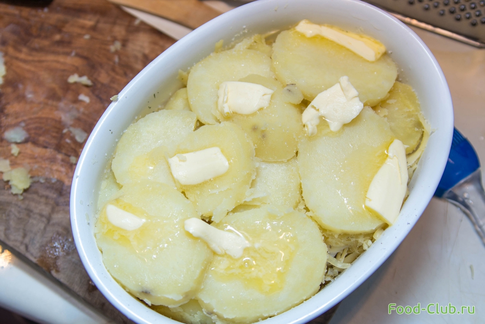 3. И затем оставшуюся картошку, посолите, поперчите, положите немного сливочного масла и посыпьте сыром.