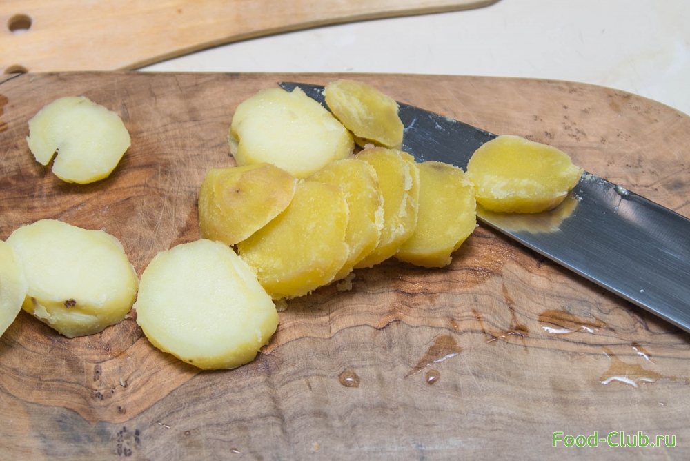1. Первым делом отварите картофель в мундире до готовности. Затем очистите от кожуры и нарежьте на ломтики толщиной около 1 см.