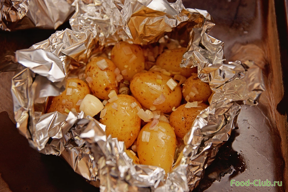 3. Из фольги сделайте два свертка (в два слоя), положите внутрь ингредиенты, закройте, положите на противень (а лучше на решетку) и поставьте в духовку примерно на 20-25 минут.